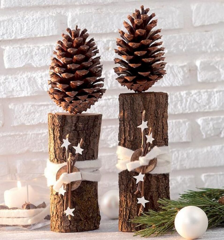 A la hora de diseñar arboles de navidad, no puedes desperdiciar los frutos de los pinos; como puedes ver quedan muy hermosos utilizando como base un tronquito de madera